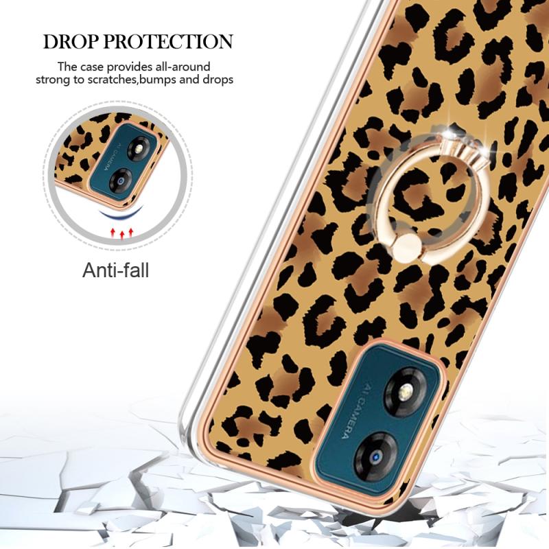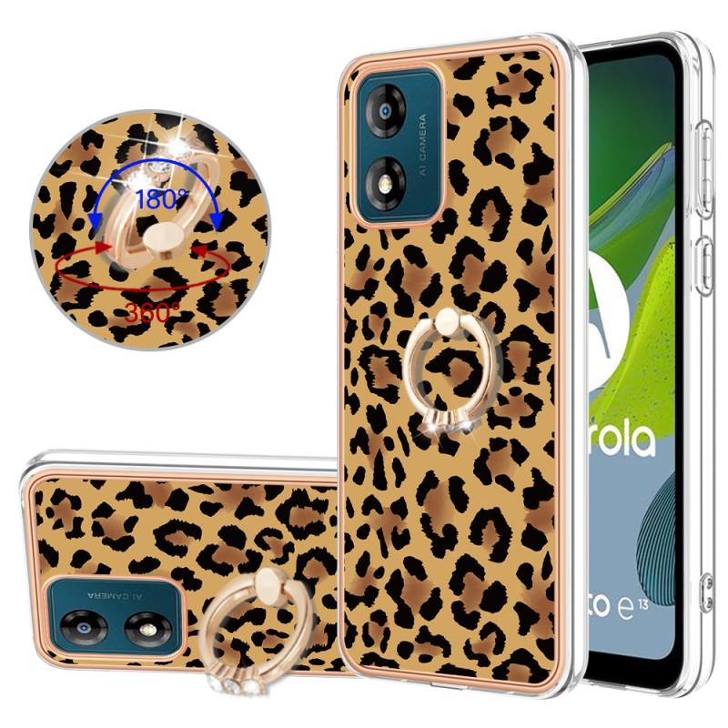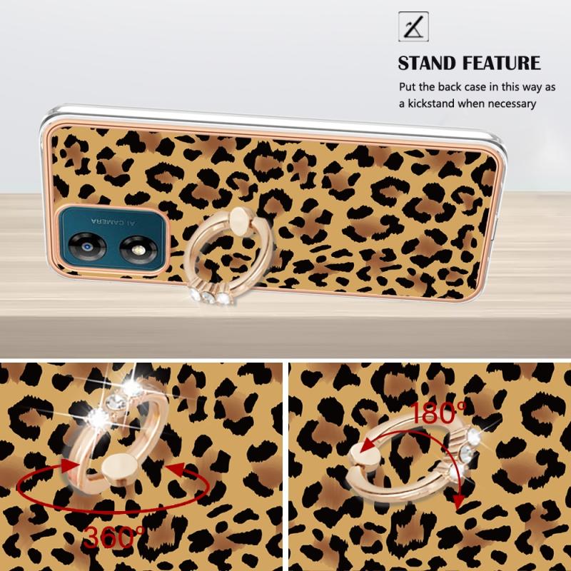 For Motorola Moto E13 Electroplating Dual-side IMD Phone Case with Ring Holder(Leopard Print)