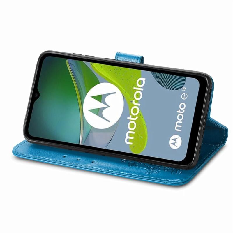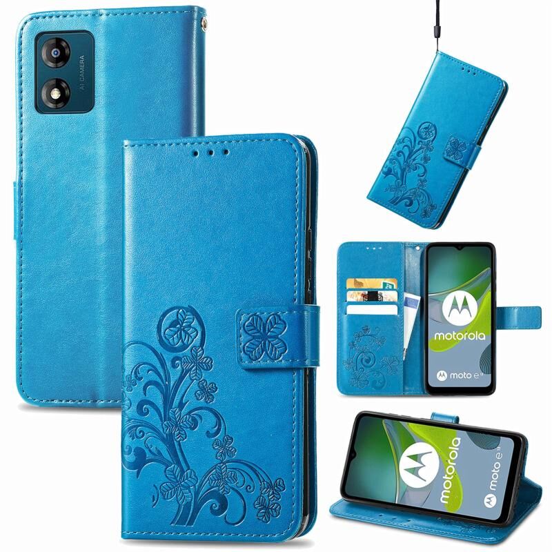 Για Motorola Moto E13 τετράφυλλο κούμπωμα ανάγλυφο αγκράφα δερμάτινη θήκη τηλεφώνου (μπλε)
