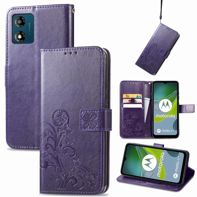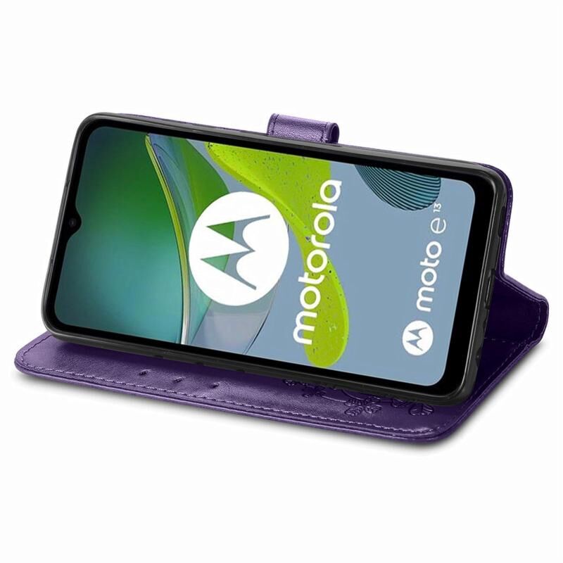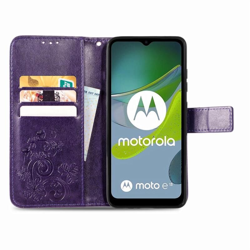 Για Motorola Moto E13 τετράφυλλο κούμπωμα ανάγλυφο αγκράφα δερμάτινη θήκη τηλεφώνου (μωβ)
