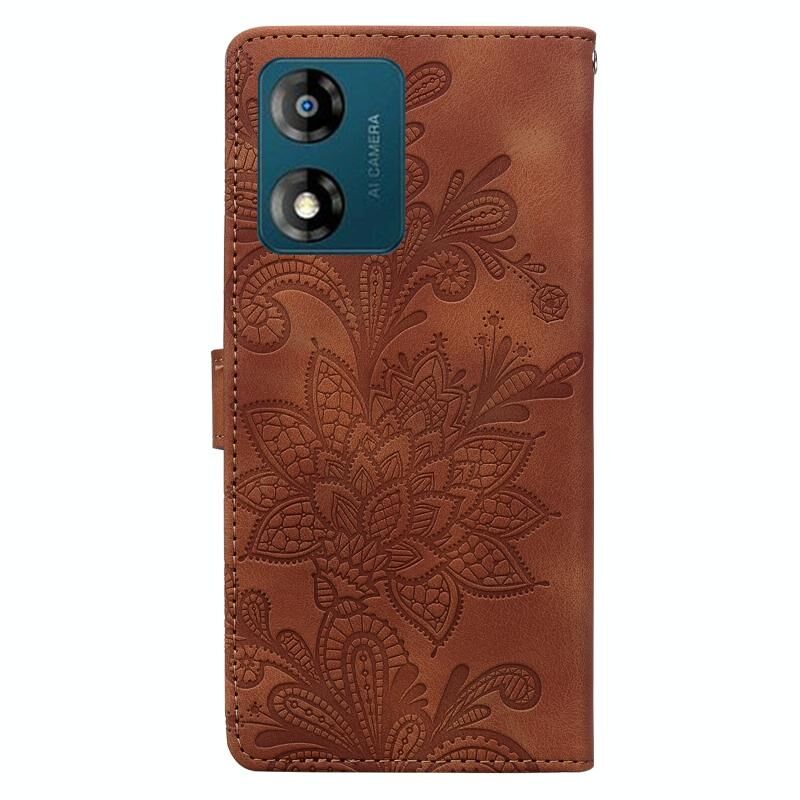 Θήκη κινητού τηλεφώνου Motorola Moto E13 με δαντέλα, λουλουδάτο ανάγλυφο, μαγνητικό κούμπωμα και λουρί καρπού (Πράσινο)