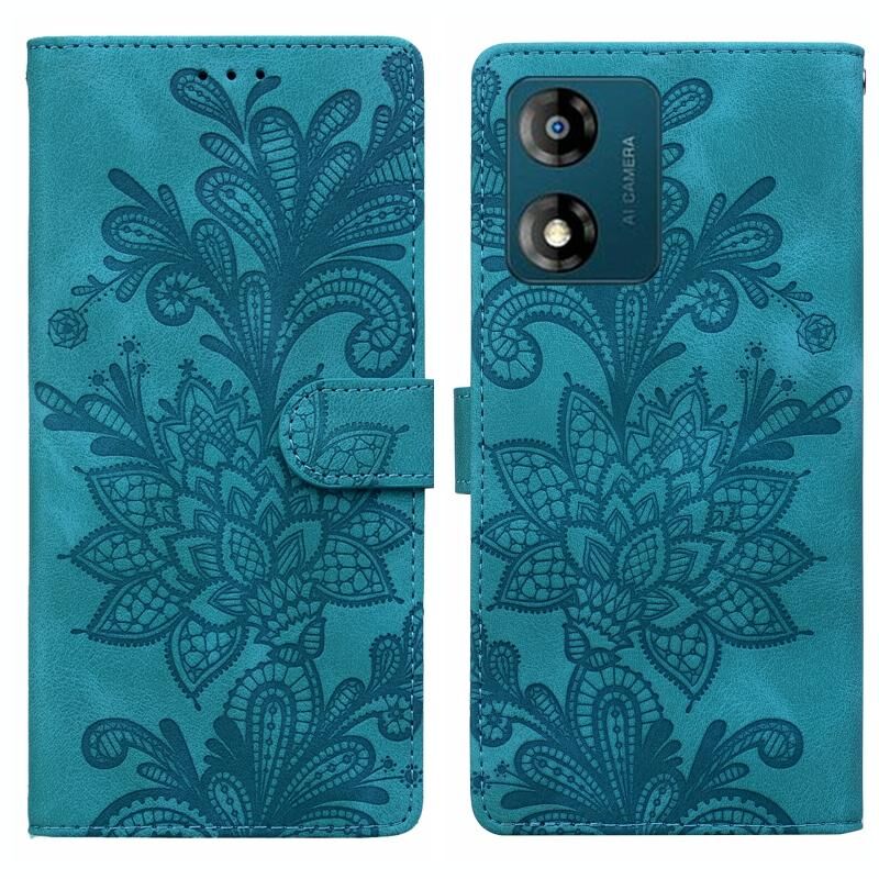 Θήκη κινητού τηλεφώνου Motorola Moto E13 με δαντέλα, λουλουδάτο ανάγλυφο, μαγνητικό κούμπωμα και λουρί καρπού (Πράσινο)