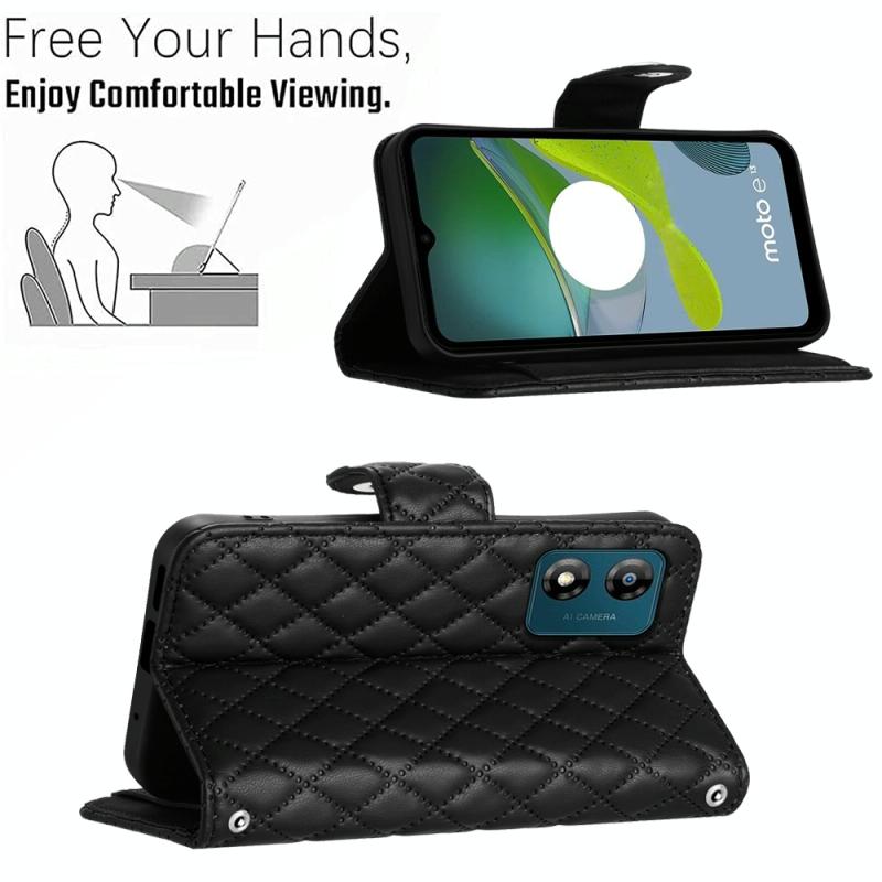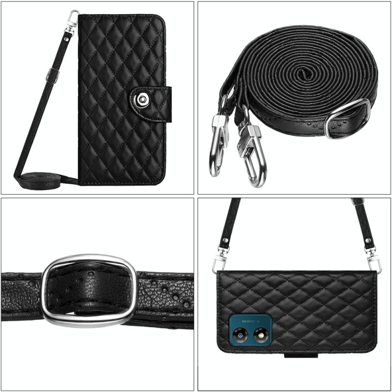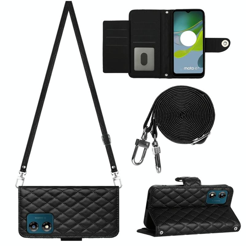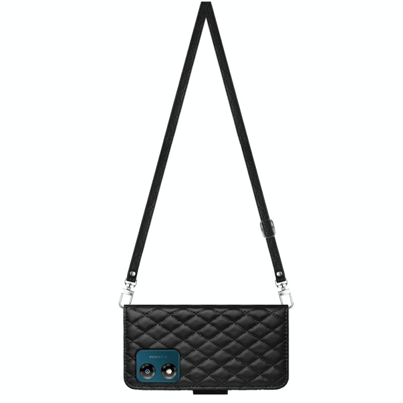 For Motorola Moto E13 Rhombic Texture Flip Leather Phone Case with Long Lanyard(Black)
