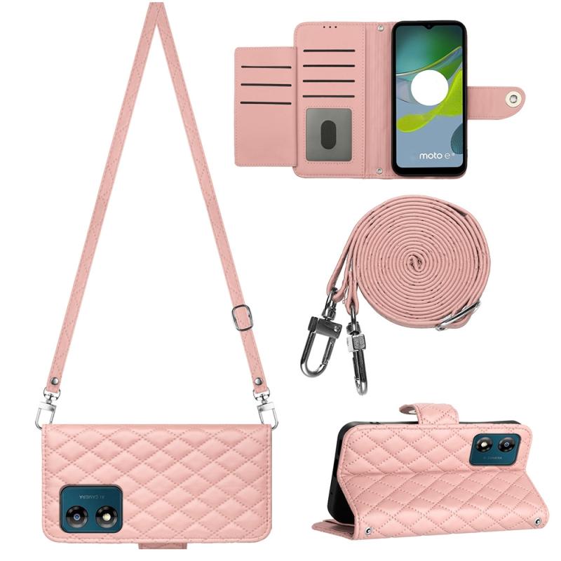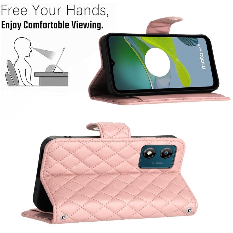 For Motorola Moto E13 Rhombic Texture Flip Leather Phone Case with Long Lanyard(Coral Pink)