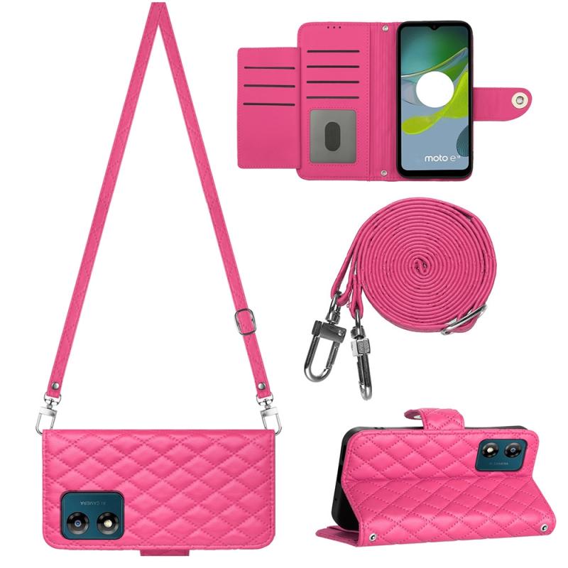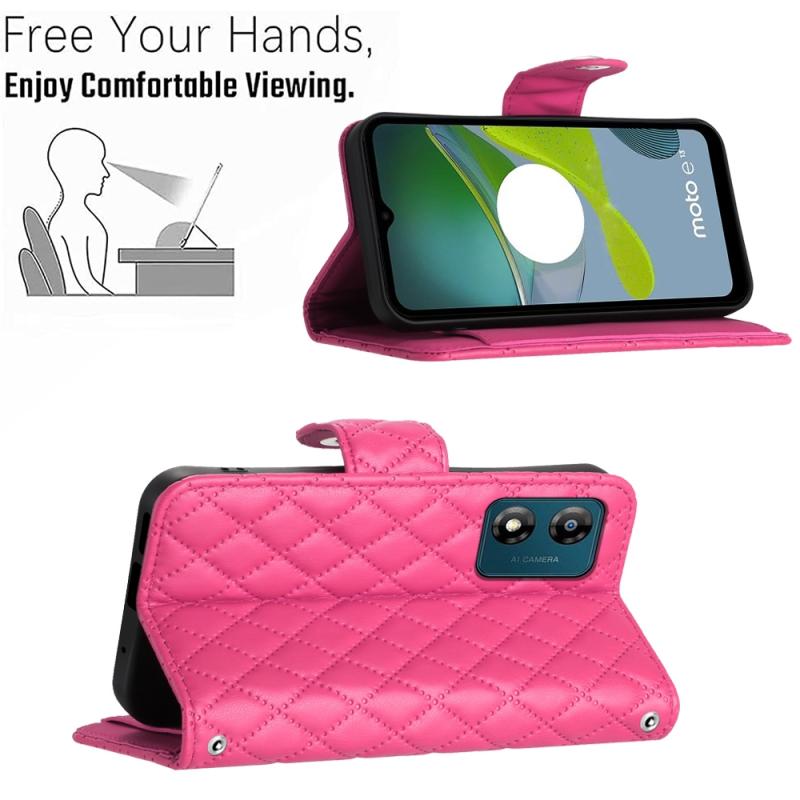 For Motorola Moto E13 Rhombic Texture Flip Leather Phone Case with Long Lanyard(Rose Red)
