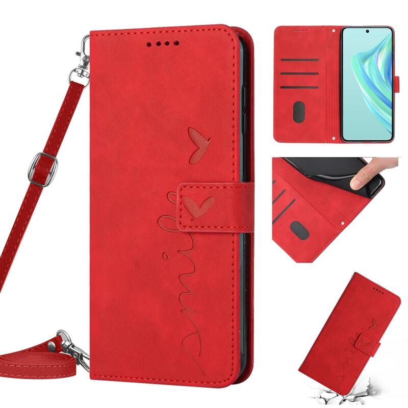Θήκη κινητού τηλεφώνου από δέρμα με σχέδιο καρδιάς και αίσθηση δέρματος για Motorola Moto E13 με κορδόνι (Κόκκινο)