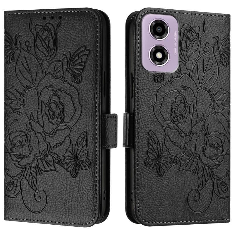 Για Motorola Moto E14 Ανάγλυφο Rose RFID Anti-theft Δερμάτινη θήκη τηλεφώνου (Μαύρο)