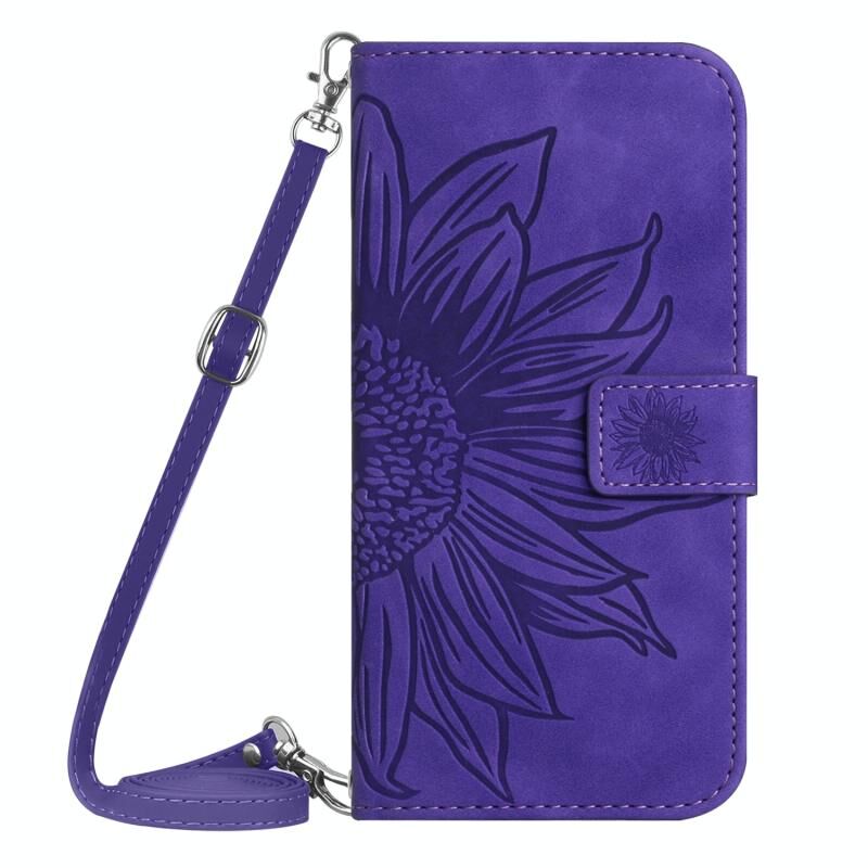 Για Motorola Moto E14 HT04 Skin Feel Sun Flower ανάγλυφο Flip δερμάτινη θήκη τηλεφώνου με κορδόνι (σκούρο μωβ)