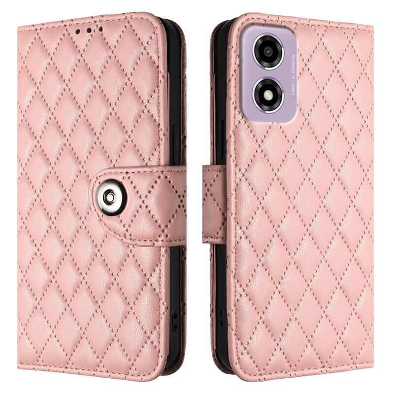 Για Motorola Moto E14 Rhombic Texture Flip δερμάτινη θήκη τηλεφώνου με κορδόνι (Coral Pink)