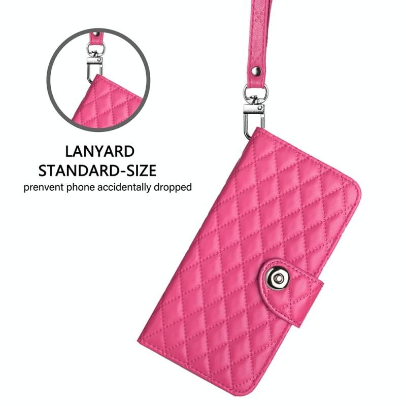 Για Motorola Moto E14 Rhombic Texture Flip δερμάτινη θήκη τηλεφώνου με κορδόνι (Rose Red)