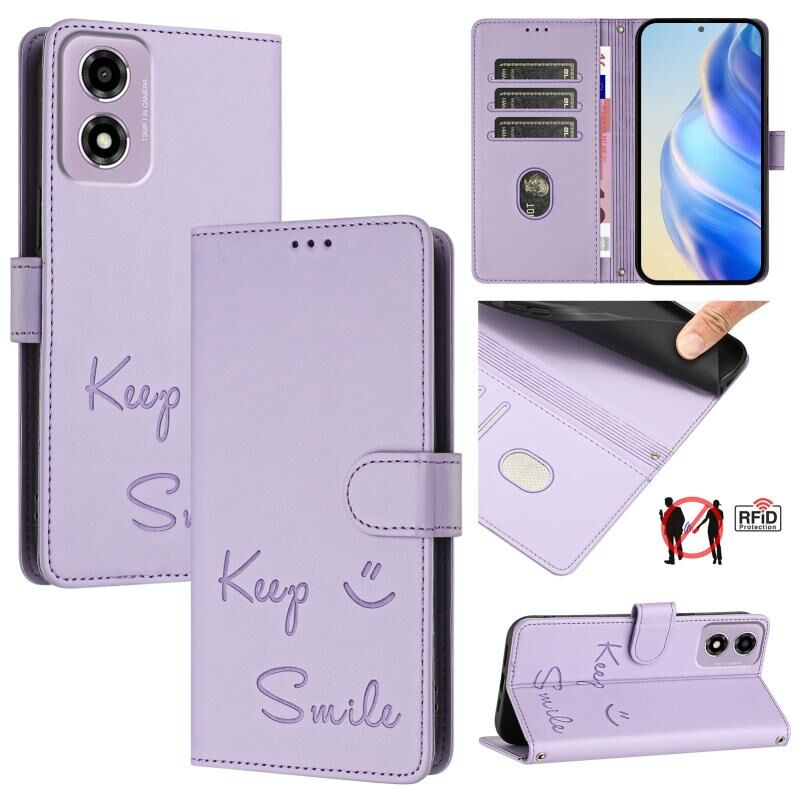 Θήκη τηλεφώνου δερμάτινη με ανάγλυφο χαμόγελο RFID για Motorola Moto E14 (Μέντας Πράσινο)