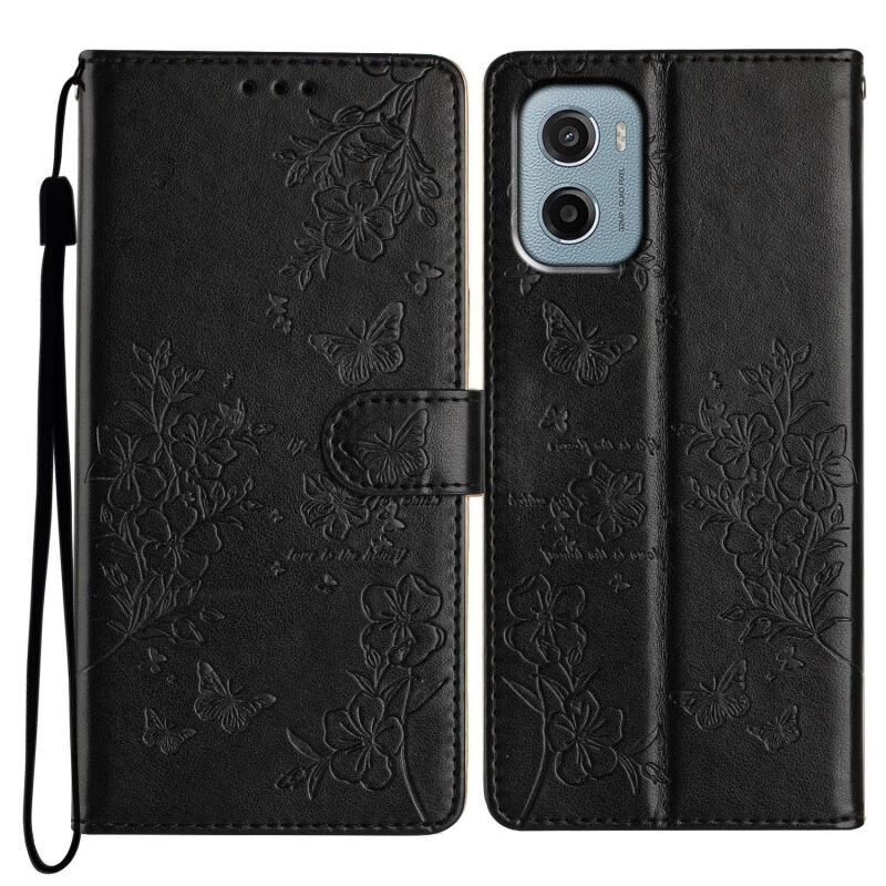 Θήκη τηλεφώνου δερμάτινη για Motorola Moto E15 με σχέδια πεταλούδες και λουλούδια (Μαύρο)