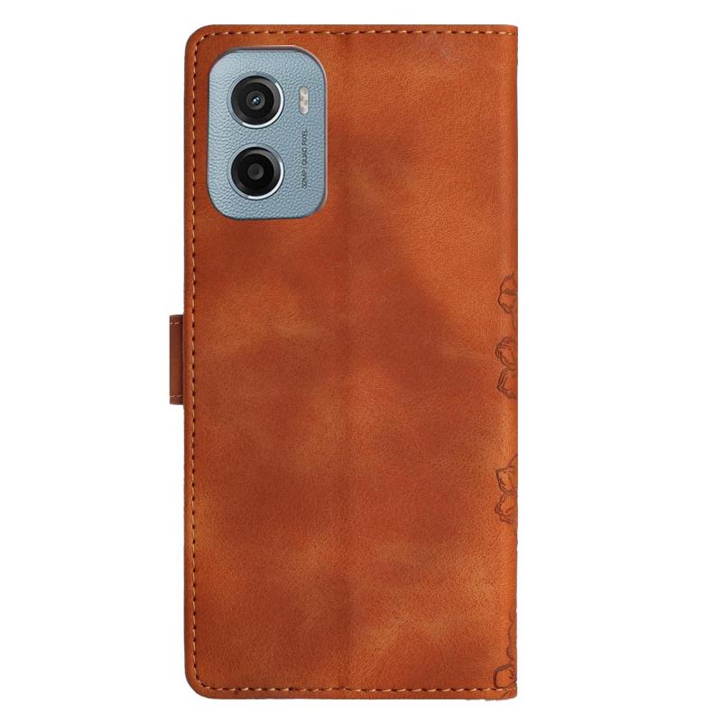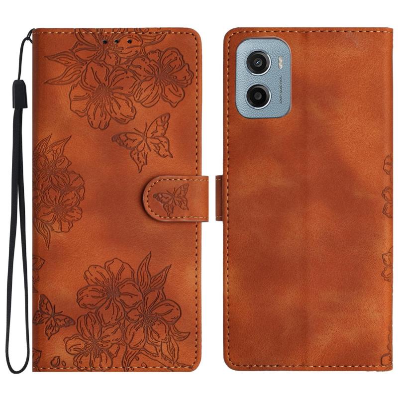 For Motorola Moto E15 Cherry Blossom Butterfly Skin Feel Embossed PU Phone Case(Brown)