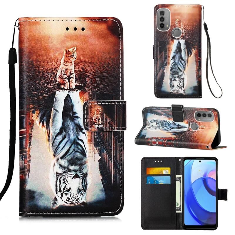 Θήκη κινητού τηλεφώνου από δέρμα με απλή ύφανση και έγχρωμο σχέδιο για Motorola Moto E20 / E30 / E40 (Γάτα και Τίγρης)