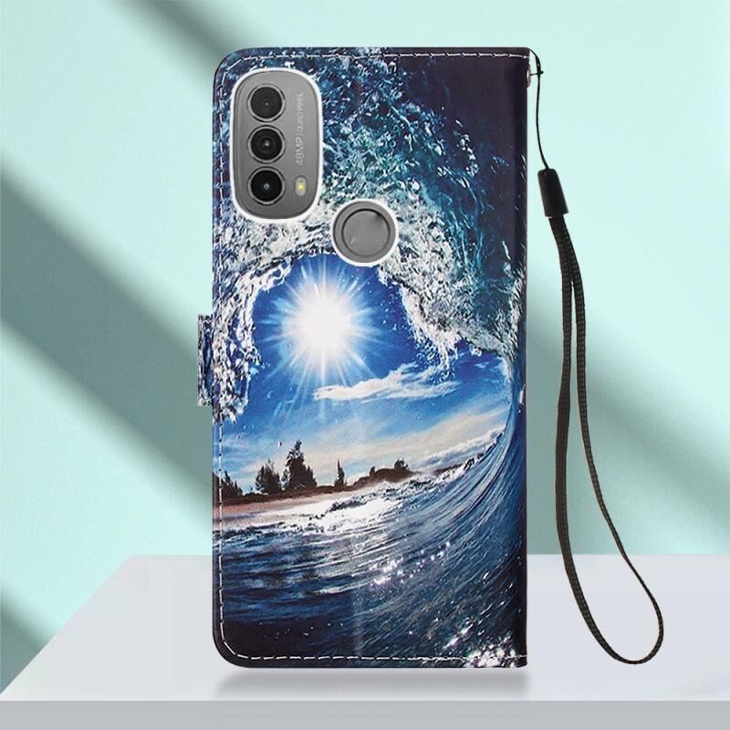 Θήκη κινητού τηλεφώνου από δέρμα με απλή ύφανση και έγχρωμο σχέδιο για Motorola Moto E20 / E30 / E40 (Κύματα και Ήλιος)