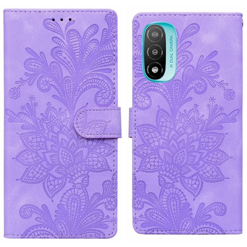 Θήκη κινητού τηλεφώνου Motorola Moto E20 με δαντελένιο floral ανάγλυφο, μαγνητικό κούμπωμα και λουρί καρπού (Πράσινο)