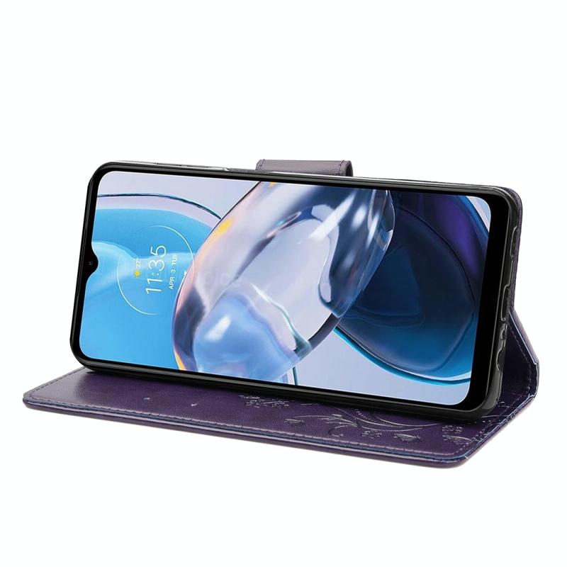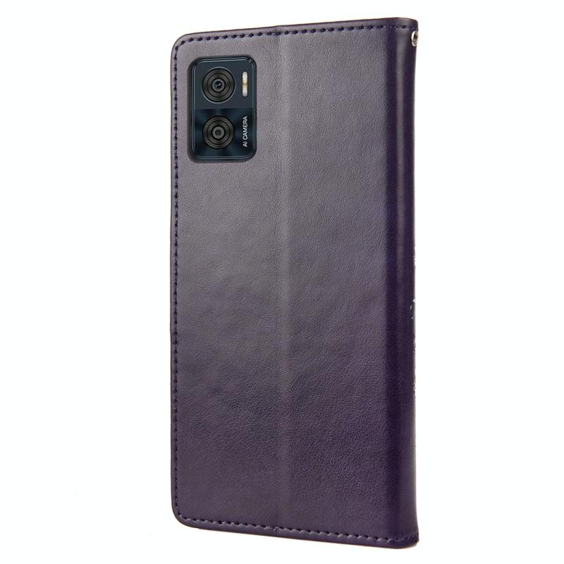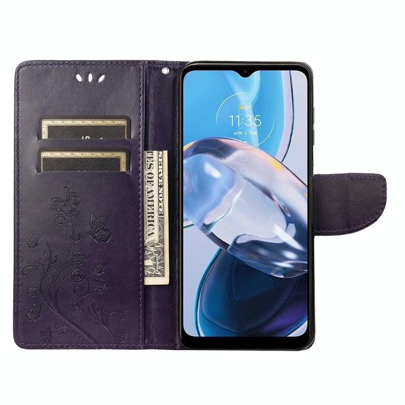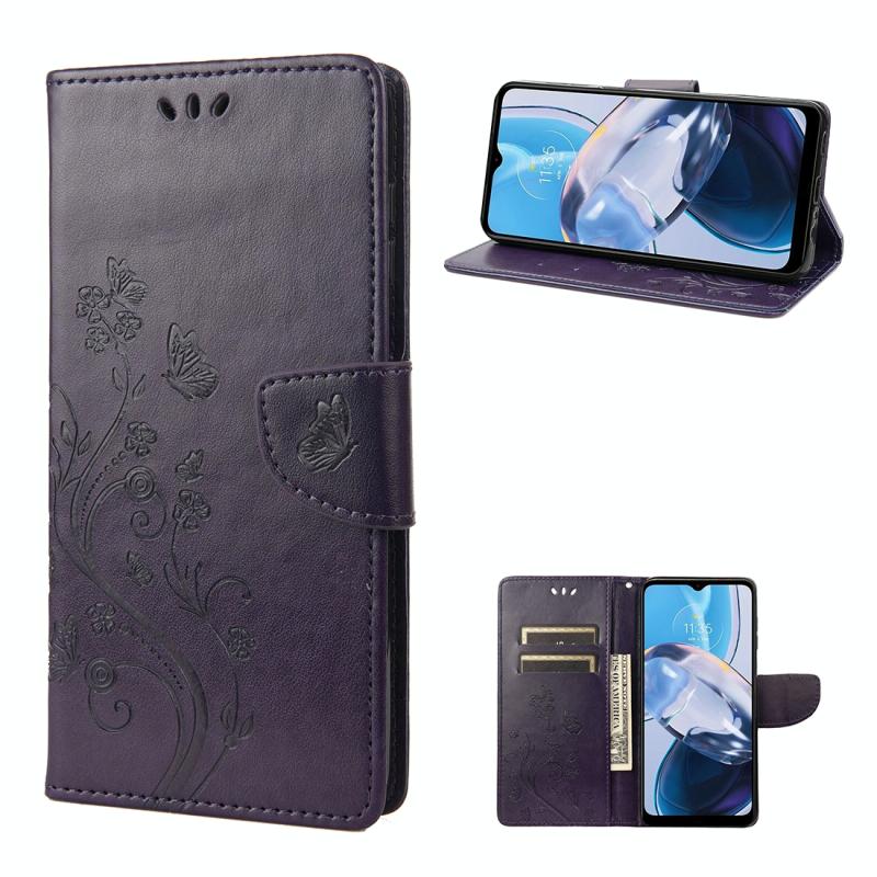 Θήκη τηλεφώνου από δέρμα με σχέδιο πεταλούδας και λουλουδιών για Motorola Moto E22 / E22i (Σκούρο μωβ)