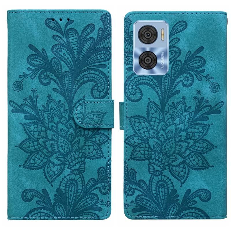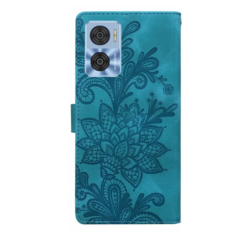 Θήκη κινητού τηλεφώνου Motorola Moto E22 / E22i από δερματίνη PU με μαγνητικό κούμπωμα, δαντελένιο floral ανάγλυφο και λουρί καρπού (Πράσινο)