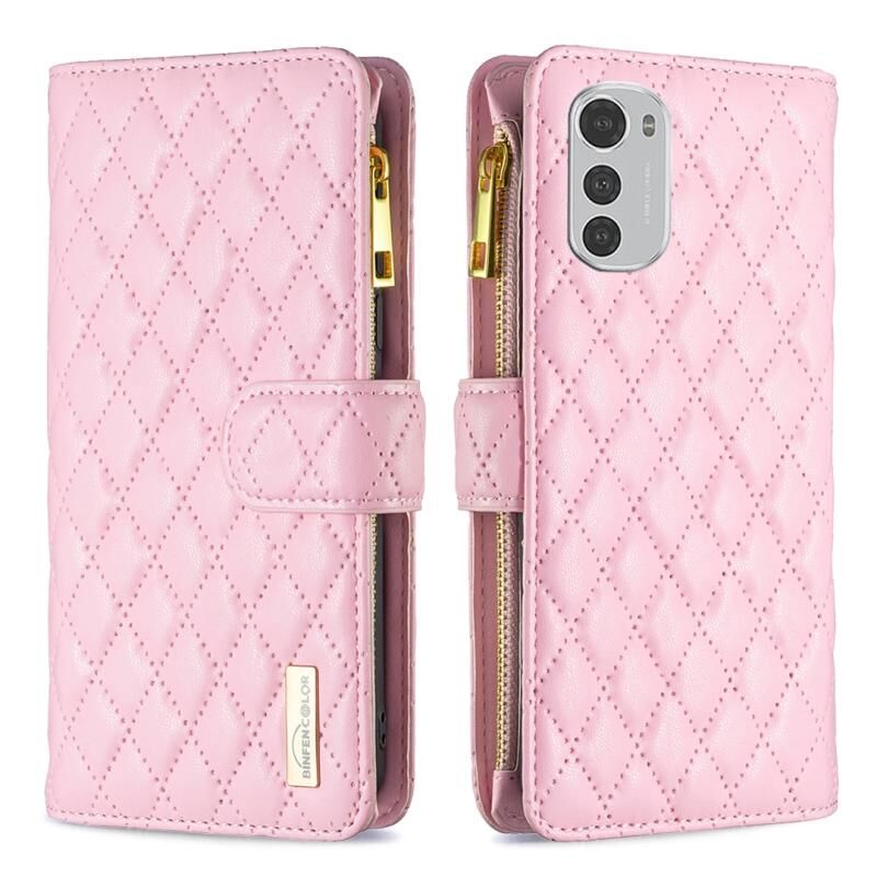 Για Motorola Moto E32 4G Diamond Lattice φερμουάρ πορτοφόλι δέρμα Flip τηλέφωνο υπόθεση (ροζ)