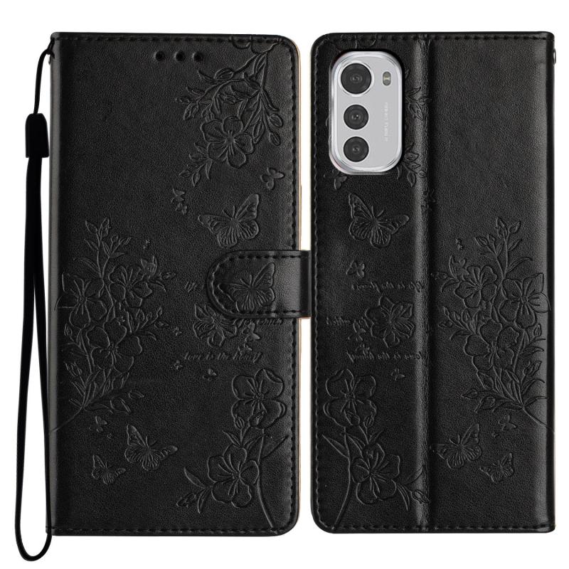 For Motorola Moto E32 Butterflies and Flowers Leather Phone Case(Black)