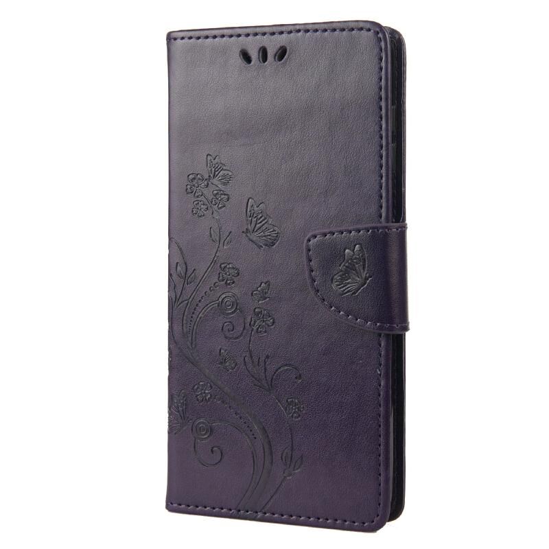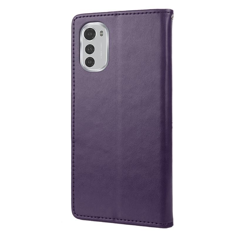 Θήκη τηλεφώνου Motorola Moto E32 με σχέδιο πεταλούδας και λουλουδιών, οριζόντια αναδιπλούμενη από δέρμα με υποδοχή για κάρτες & βάση (Σκούρο μωβ)