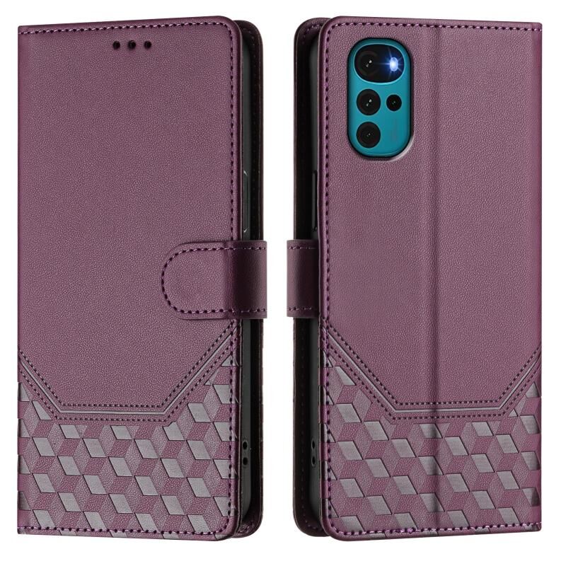 Για Motorola Moto E32 Ινδία / G22 4G Honeycomb ανάγλυφη RFID δερμάτινη θήκη τηλεφώνου (βιολετί)