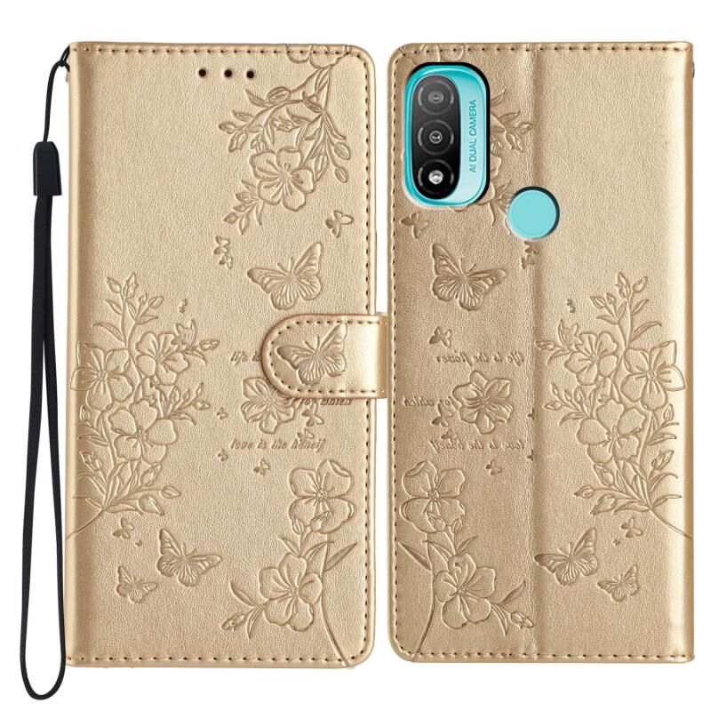 Θήκη τηλεφώνου δερμάτινη για Motorola Moto E40 με σχέδια πεταλούδες και λουλούδια (Χρυσό)