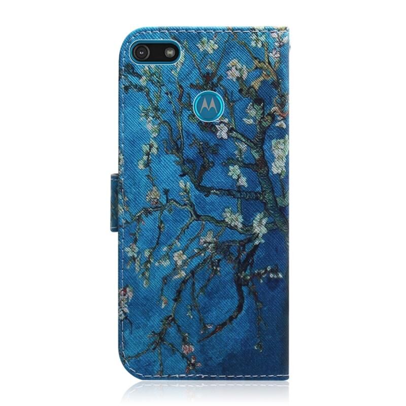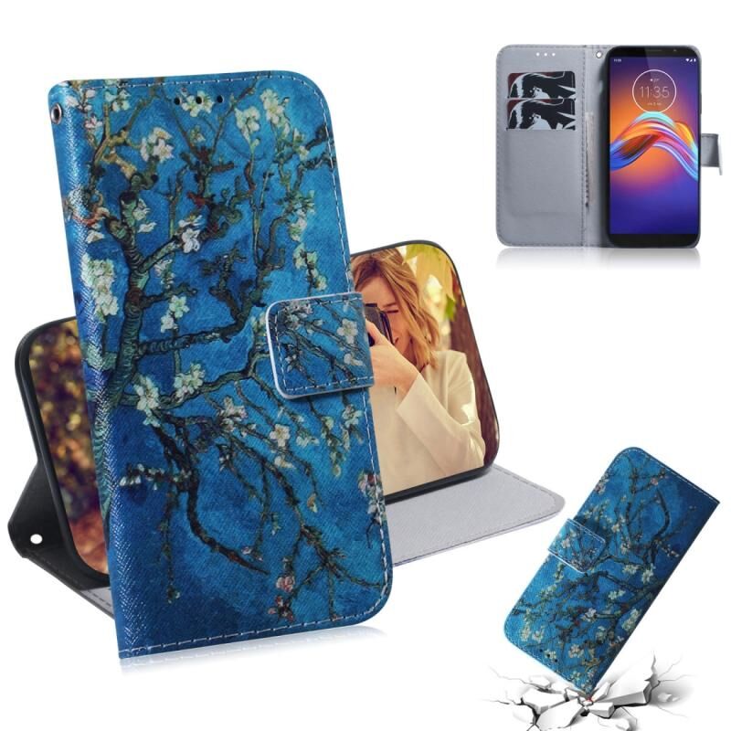 Θήκη δέρματος οριζόντιας αναδίπλωσης με μαγνητική έλξη και συνδυασμένο σχέδιο για Motorola Moto E6 Play, με βάση στήριξης, θήκη για κάρτες και πορτοφόλι (Απρικοτί Ανθός)