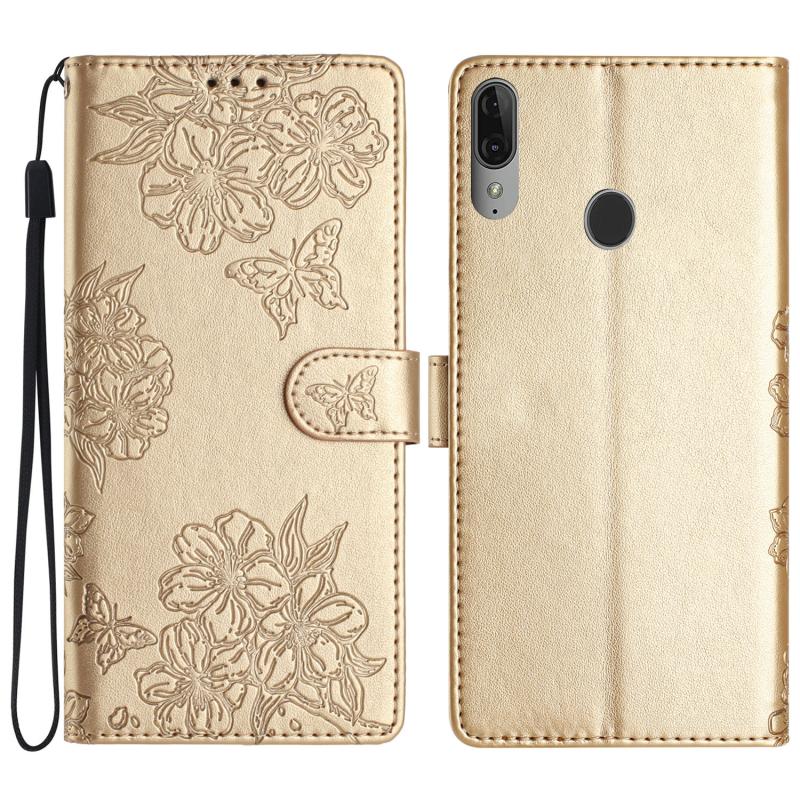For Motorola Moto E6 Plus Cherry Blossom Butterfly Skin Feel Embossed PU Phone Case(Gold)