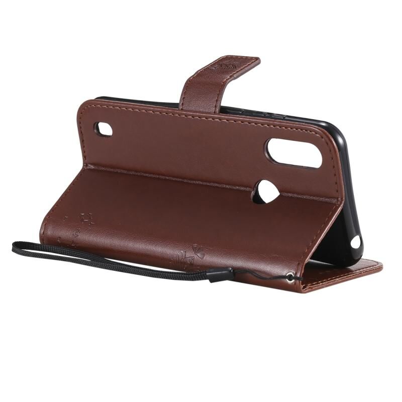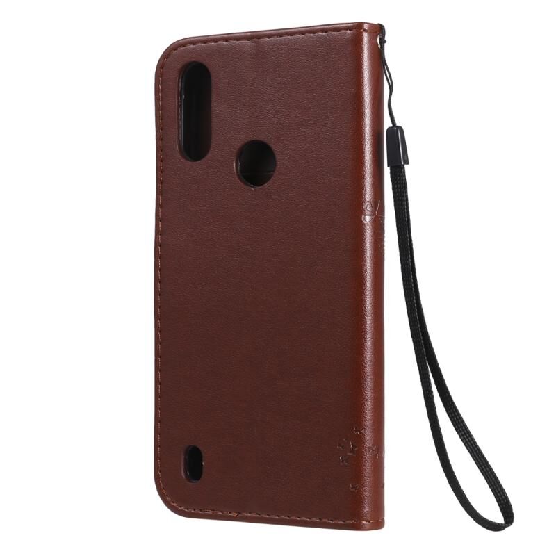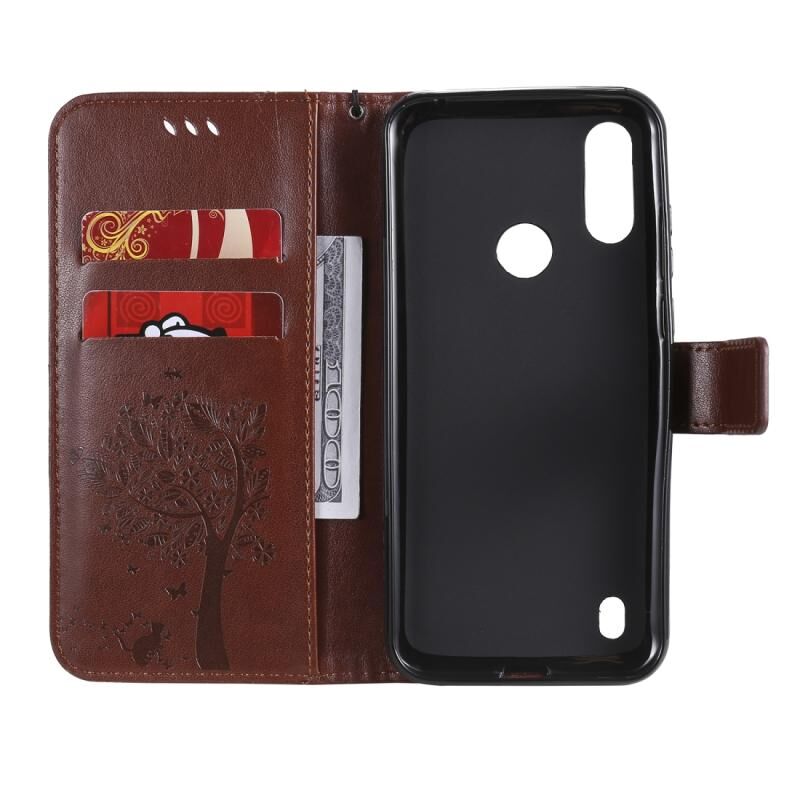 Θήκη δέρματος οριζόντιας αναδίπλωσης με ανάγλυφο σχέδιο δέντρου & γάτας για Motorola Moto E6s (2020) με βάση στήριξης & θήκες καρτών & πορτοφόλι & κορδόνι (Καφέ)