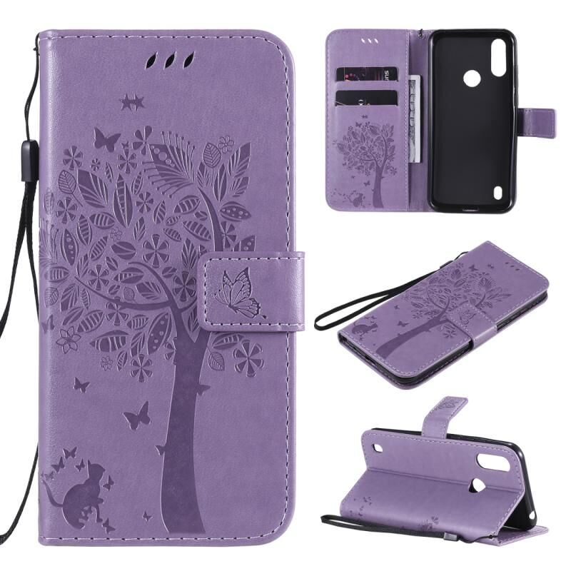 Θήκη δέρματος οριζόντιας αναδίπλωσης με ανάγλυφο σχέδιο δέντρου & γάτας για Motorola Moto E6s (2020) με βάση στήριξης & θήκες καρτών & πορτοφόλι & κορδόνι (Μωβ)