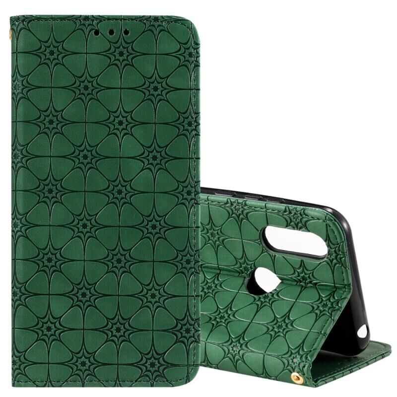 Θήκη δέρματος με μαγνητικό κλείσιμο, οριζόντια, με ανάγλυφο σχέδιο λουλουδιών Lucky Flowers για Motorola Moto E6s, με βάση στήριξης & θήκες για κάρτες (Πράσινο)