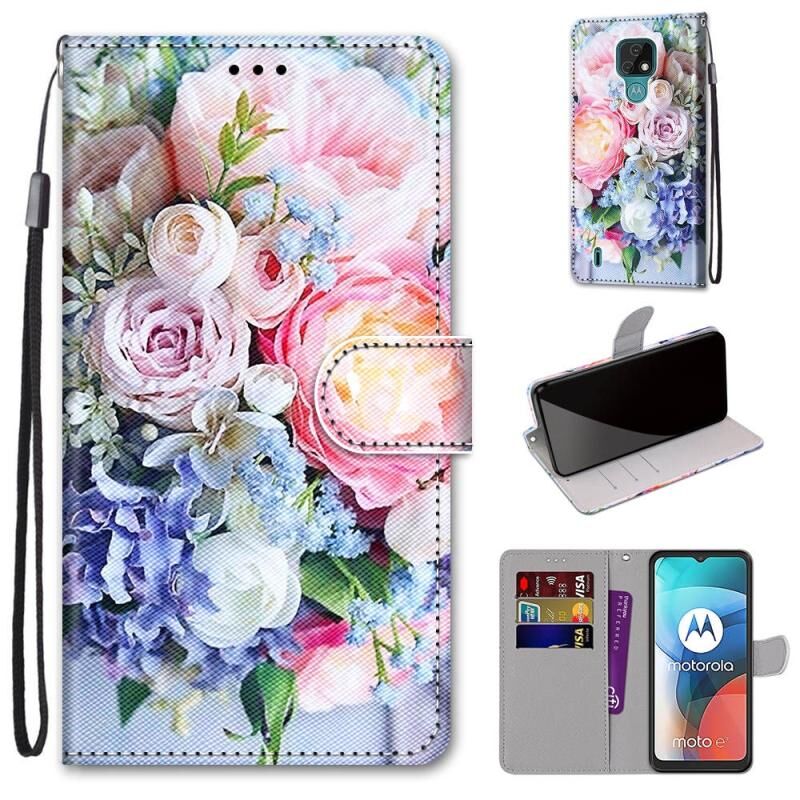 Θήκη για Motorola Moto E7 με έγχρωμο σχέδιο, υφή σταυρού, οριζόντιο άνοιγμα, από δερματίνη PU με βάση, θήκες για κάρτες, πορτοφόλι & λουρί (Light Pink Bouquet)