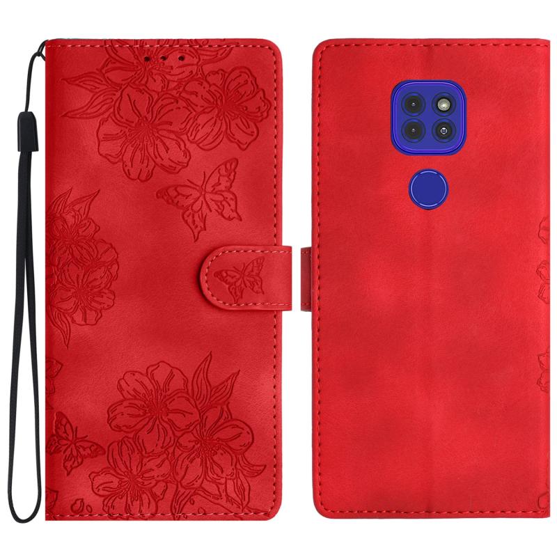 For Motorola Moto E7 Plus Cherry Blossom Butterfly Skin Feel Embossed PU Phone Case(Red)