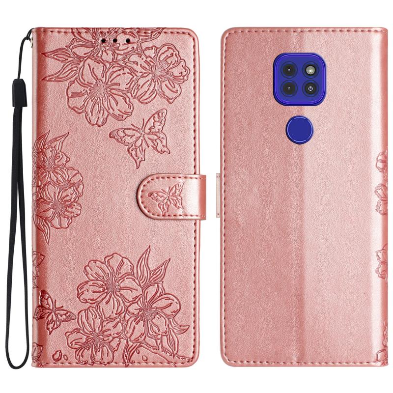 For Motorola Moto E7 Plus Cherry Blossom Butterfly Skin Feel Embossed PU Phone Case(Rose Gold)