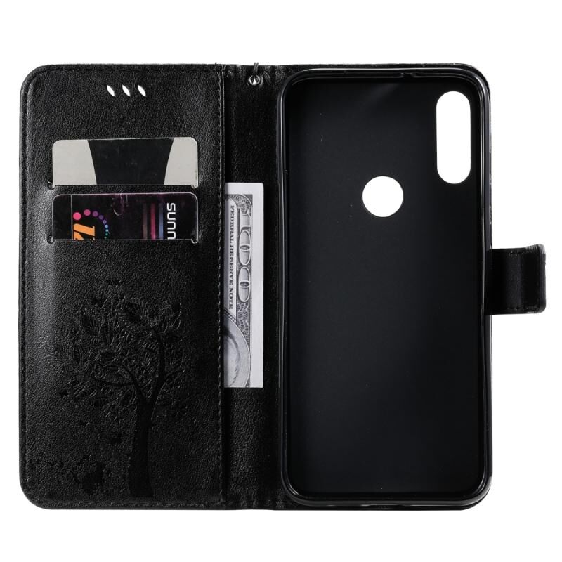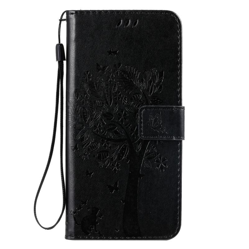 Θήκη για Motorola Moto E7 με σχέδιο Δέντρου & Γάτας, εκτυπωμένη με θερμοτύπηση, οριζόντια, από δερματίνη PU με βάση στήριξης & θήκες για κάρτες & πορτοφόλι & κορδόνι (Μπλε)