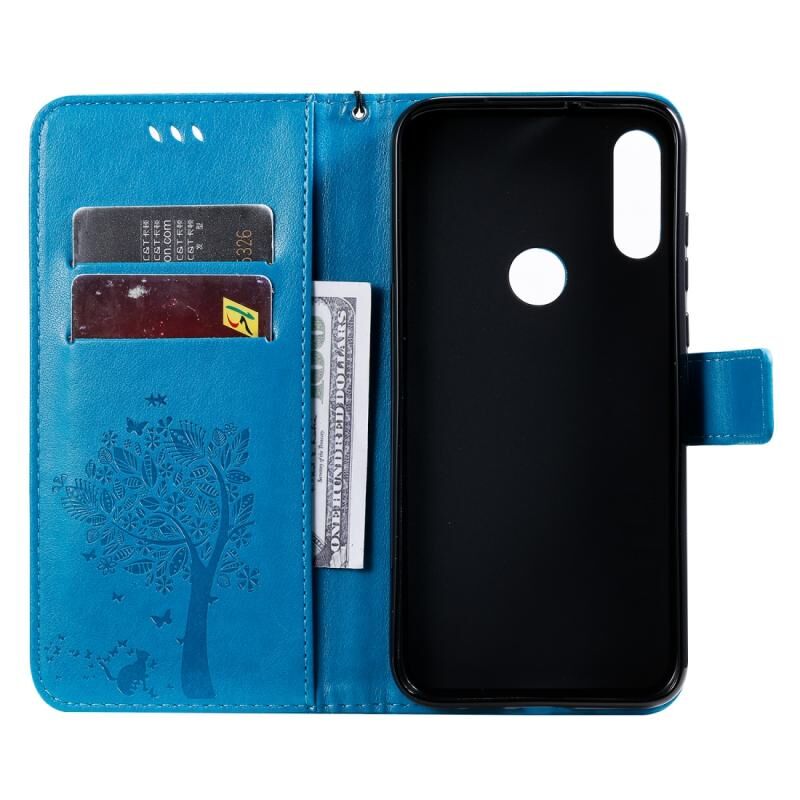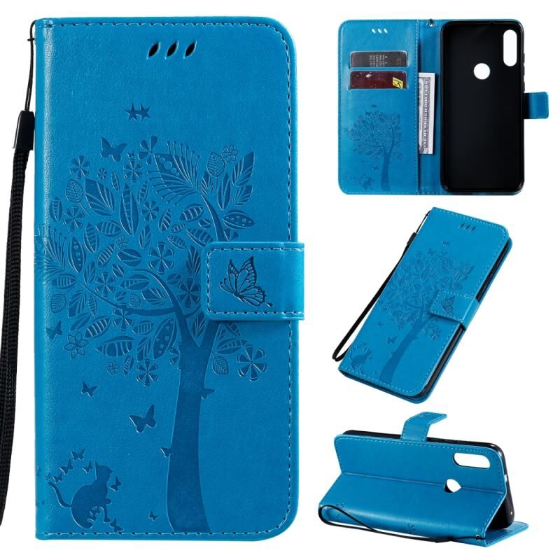 Θήκη για Motorola Moto E7 με σχέδιο Δέντρου & Γάτας, εκτυπωμένη με θερμοτύπηση, οριζόντια, από δερματίνη PU με βάση στήριξης & θήκες για κάρτες & πορτοφόλι & κορδόνι (Μπλε)