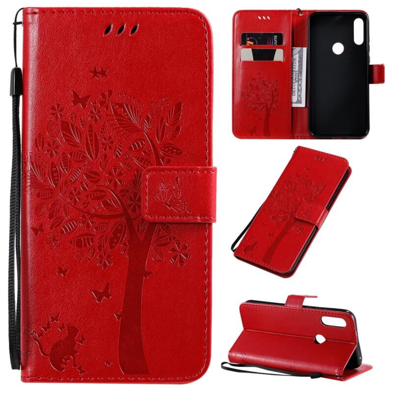 Θήκη για Motorola Moto E7 με σχέδιο Δέντρου & Γάτας, εκτυπωμένη με θερμοτύπηση, οριζόντια, από δερματίνη PU με βάση στήριξης & θήκες για κάρτες & πορτοφόλι & κορδόνι (Πράσινο)