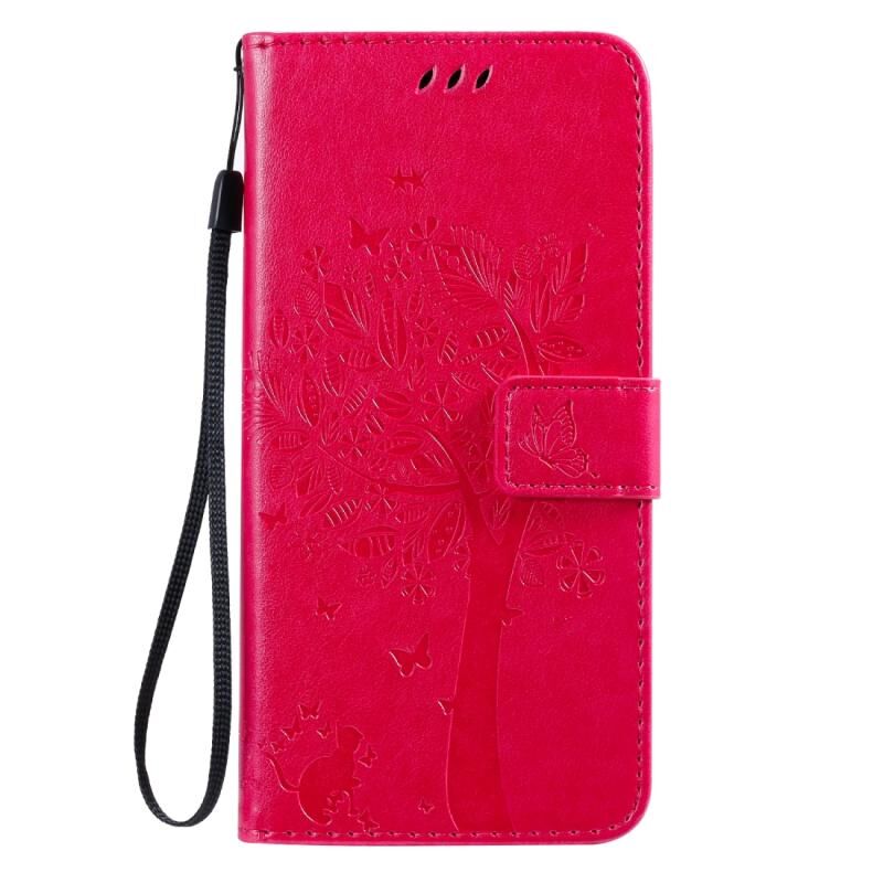 Θήκη για Motorola Moto E7 με σχέδιο Δέντρου & Γάτας, εκτυπωμένη με θερμοτύπηση, οριζόντια, από δερματίνη PU με βάση στήριξης & θήκες για κάρτες & πορτοφόλι & κορδόνι (Μπλε)