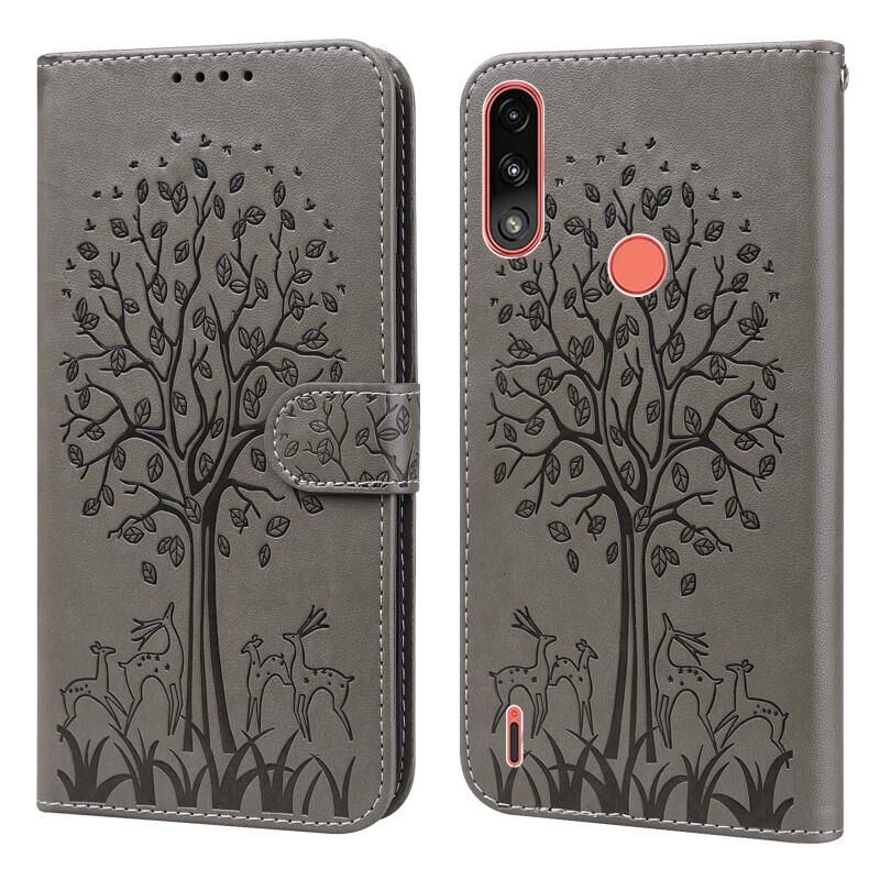 Για Motorola Moto E7i Power / E7 Power Tree & Deer Pattern Pressed Printing Horizontal Flip Leather Phone Case (Γκρι)