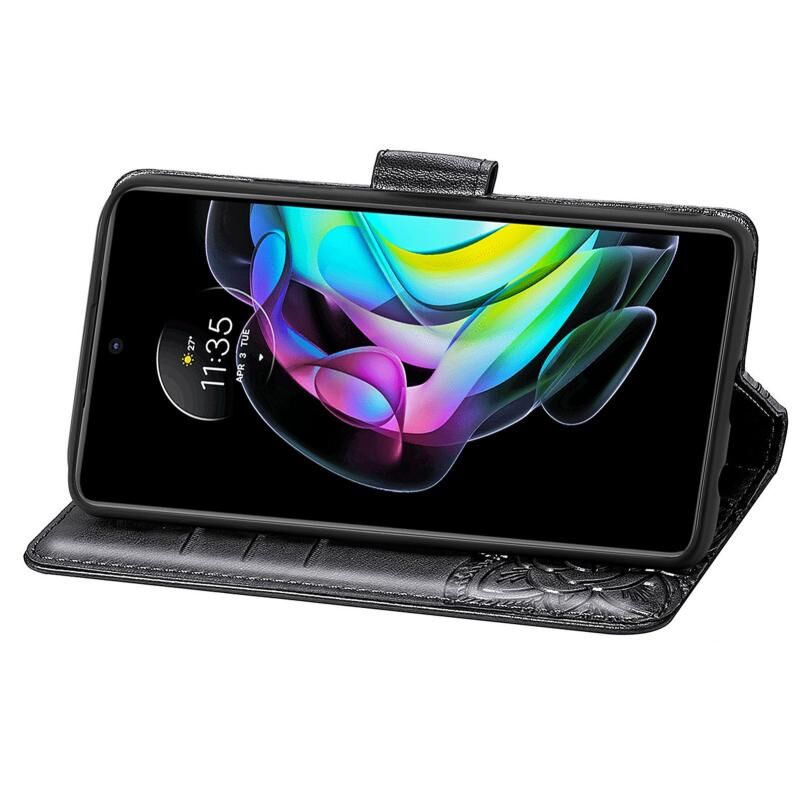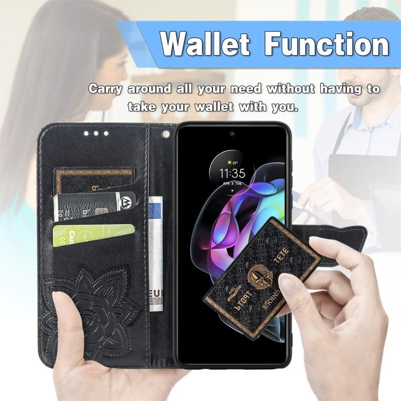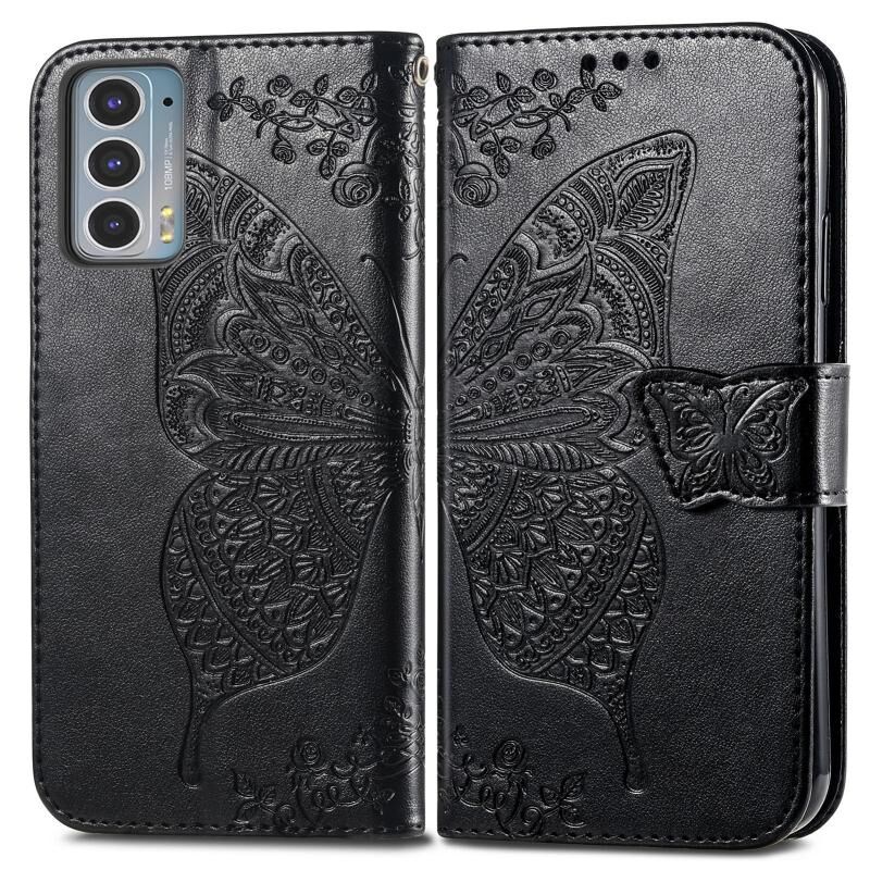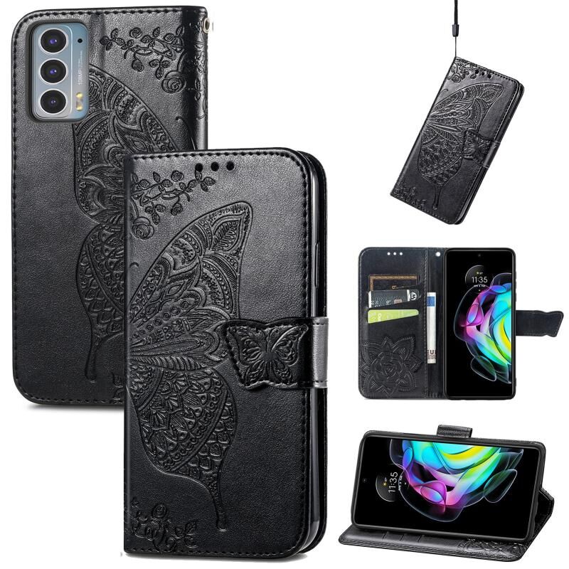 Θήκη δέρματος οριζόντιας αναδίπλωσης για Motorola Moto Edge 20 με ανάγλυφο σχέδιο Butterfly Love Flower, με βάση, θήκες καρτών, πορτοφόλι και λουρί (Μαύρο)