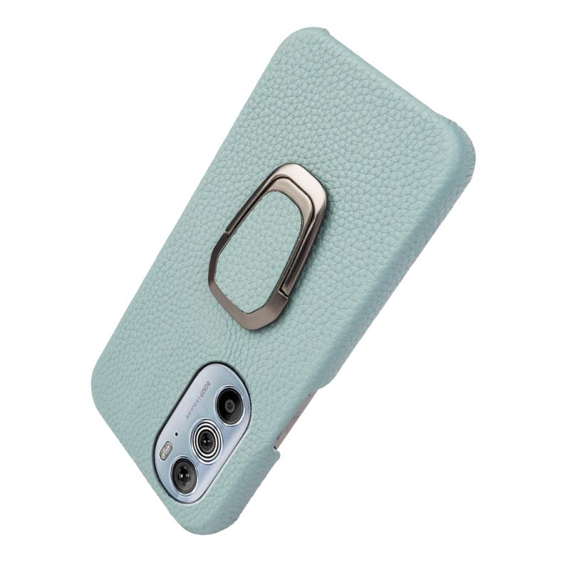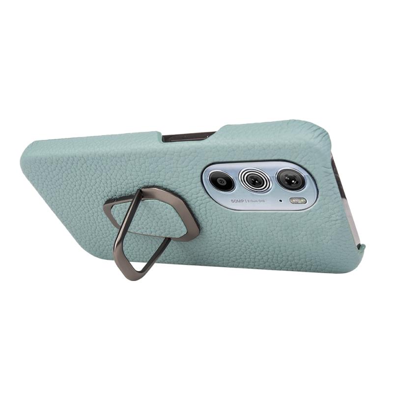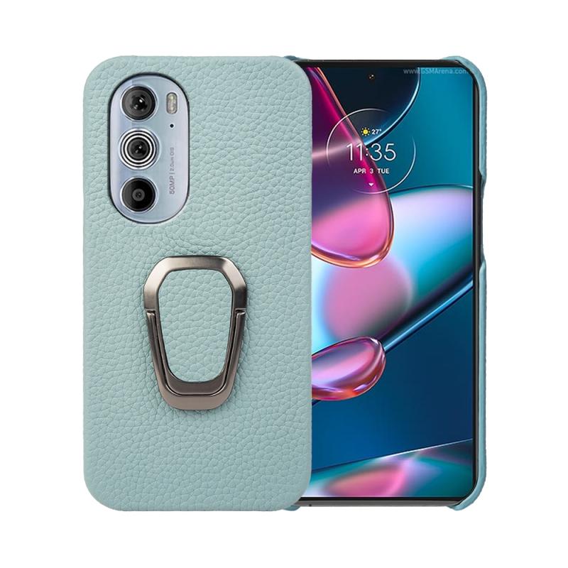 For Motorola Moto Edge 30 Pro Ring Holder Litchi Texture Genuine Leather Phone Case(Cyan)