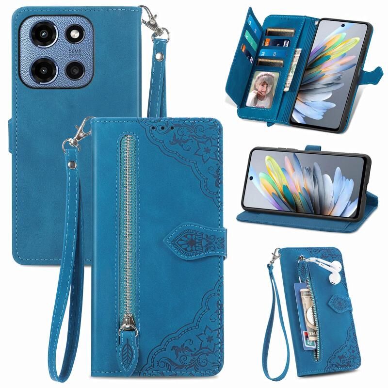 Θήκη κινητού τηλεφώνου δερμάτινη με φερμουάρ και ανάγλυφο λουλούδι για Motorola Moto G 2025 (Μπλε)