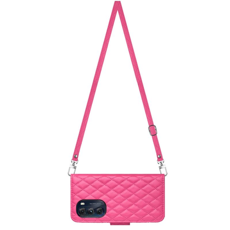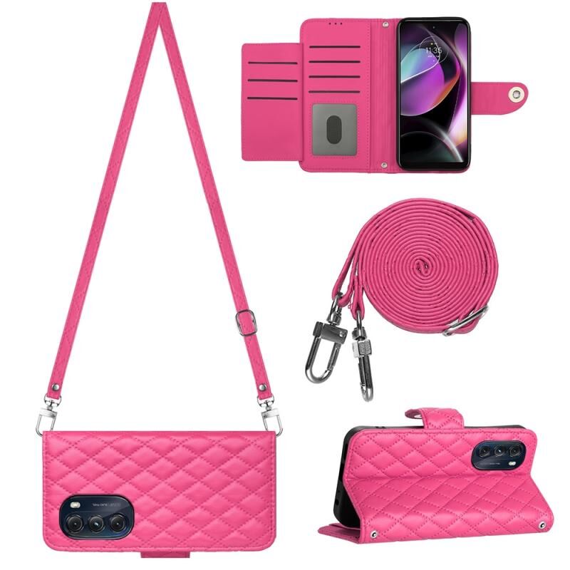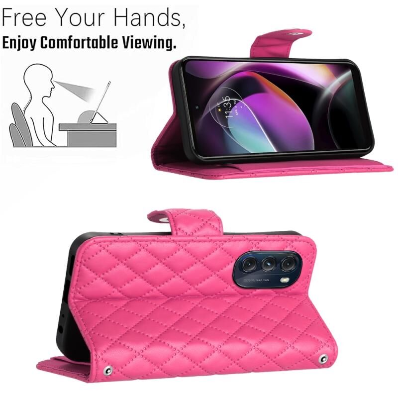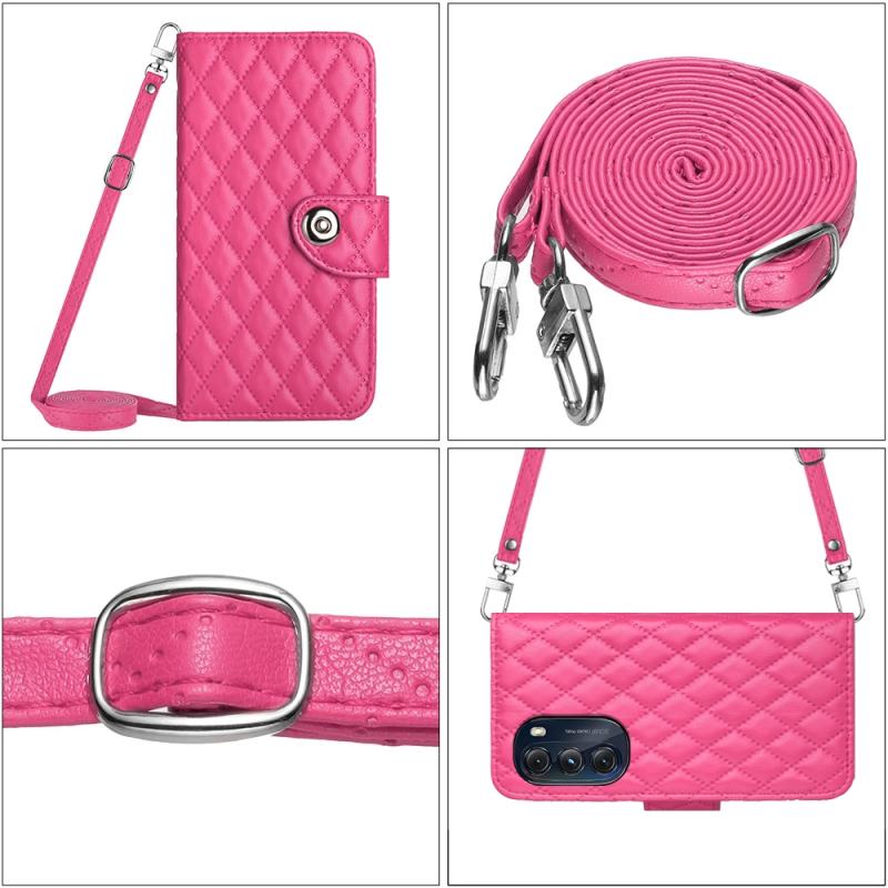 For Motorola Moto G 5G 2022 Rhombic Texture Flip Leather Phone Case with Long Lanyard(Rose Red)
