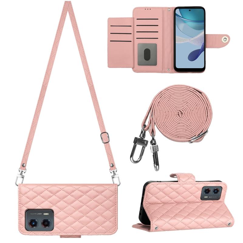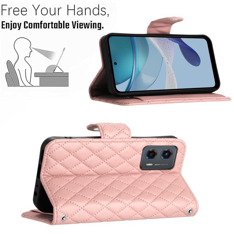 For Motorola Moto G 5G 2023 Rhombic Texture Flip Leather Phone Case with Long Lanyard(Coral Pink)
