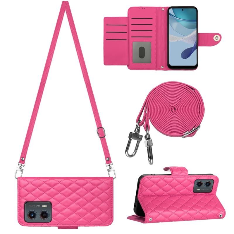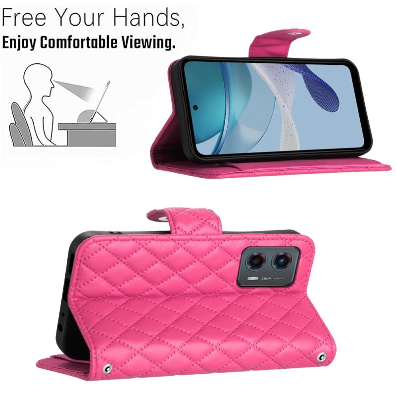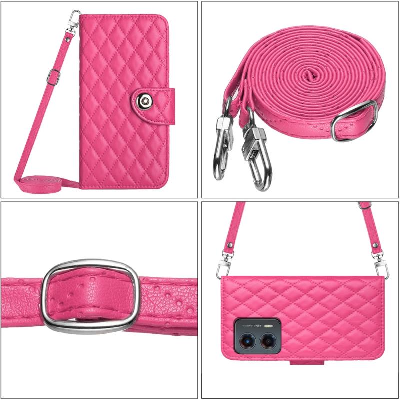 For Motorola Moto G 5G 2023 Rhombic Texture Flip Leather Phone Case with Long Lanyard(Rose Red)