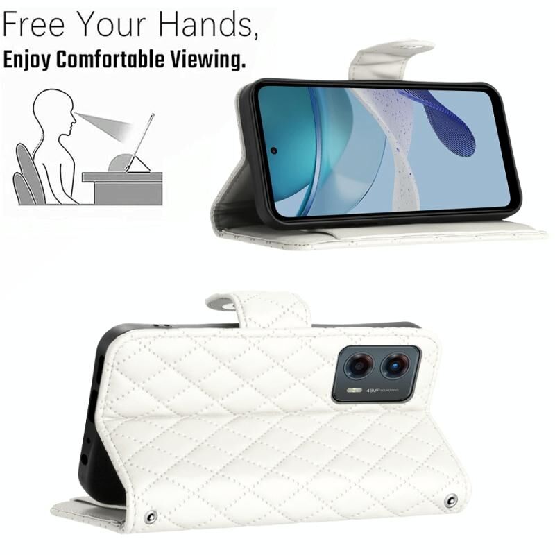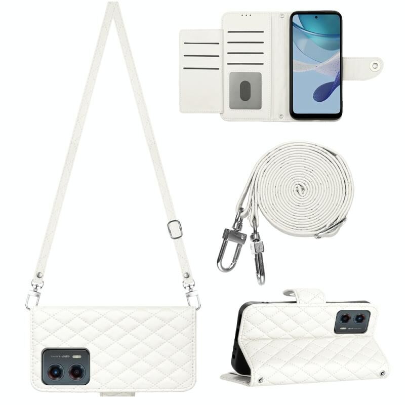 For Motorola Moto G 5G 2023 Rhombic Texture Flip Leather Phone Case with Long Lanyard(White)
