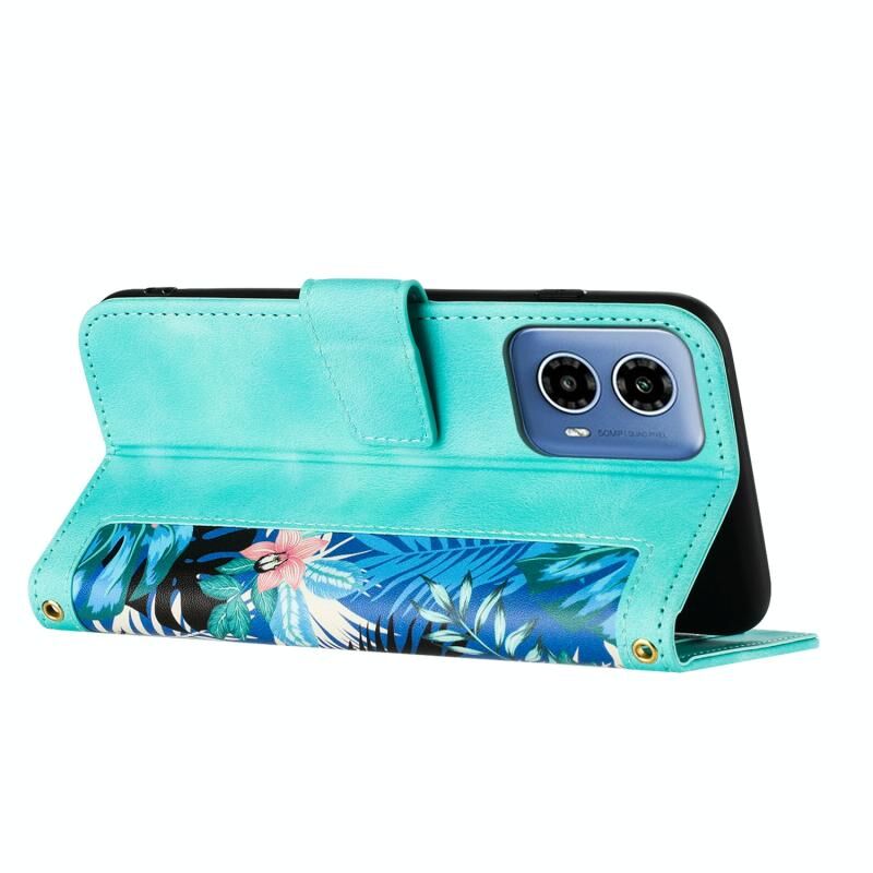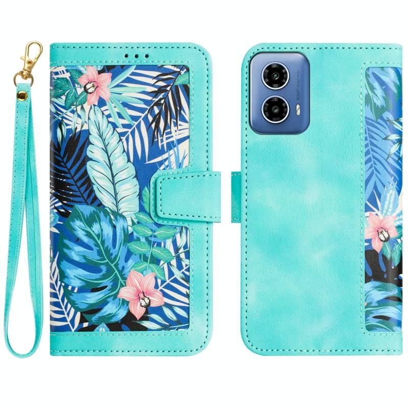 Θήκη τηλεφώνου από δέρμα με λουλουδάτο σχέδιο για Motorola Moto G 5G 2024 με κορδόνι (Ανοιχτό Μπλε)