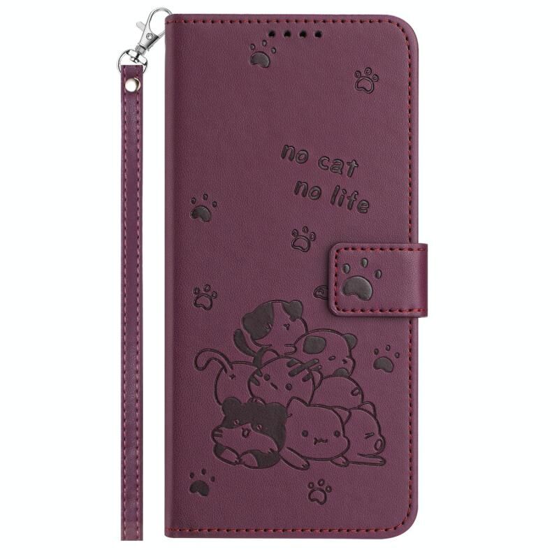 Θήκη δερμάτινη για Motorola Moto G 5G 2025 με ανάγλυφο σχέδιο γατάκι και λουρί (Μωβ)