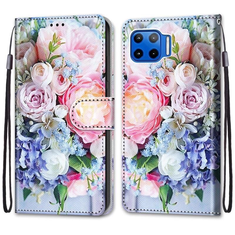 Θήκη για Motorola Moto G 5G Plus με πολύχρωμο σχέδιο, υφή σταυρού, οριζόντιο άνοιγμα, από δερματίνη PU με βάση στήριξης, θήκες για κάρτες, πορτοφόλι & λουρί (Ροζ Λουλούδια - Γέφυρα του Πύργου).