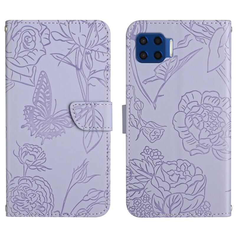 Θήκη κινητού τηλεφώνου από δέρμα με ανάγλυφο σχέδιο πεταλούδας και παιώνιας για Motorola Moto G 5G Plus (Κόκκινο)